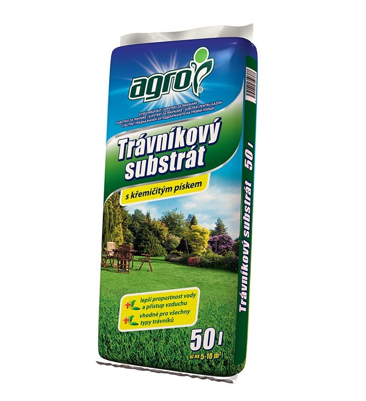 AGRO Trávníkový substrát slouží především pro zlepšení kvality půdy před založením trávníku, dále pro překrývání trávníku během vegetace a výborných výsledků dosahuje při regeneraci poškozených míst. Jemně prosátá rašelina, kvalitní kompost a speciální křemičitý písek tvoří základ substrátu pro trávníky.