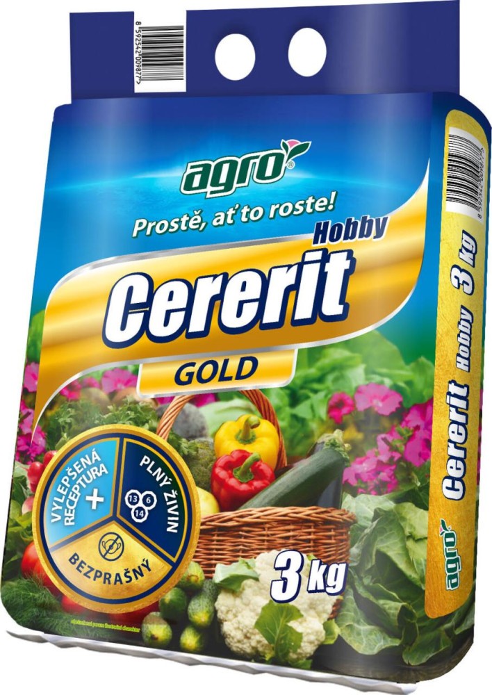 AGRO CERERIT Hobby® Gold je bezchloridové granulované (kompaktované) hnojivo, obsahující mikro- a makroprvky, jako je železo, vápník a hořčík. Je určené k výživě ovoce, zeleniny, chmele a okrasných rostlin. Používá se k základnímu hnojení i přihnojení během vegetace. Zvýšený obsah draslíku podporuje vyzrávání, lepší zbarvení plodu a vyšší cukernatost. Přidaný obsah železa zabraňuje žloutnutí listů. U jehličnanů je pak účinnou prevencí proti hnědnutí jehlic.