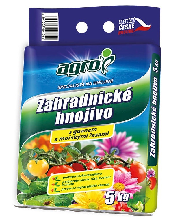 AGRO Zahradnické hnojivo je univerzální bezchloridové granulované organominerální hnojivo. Obsahuje vysoké dávky živin ve formě okamžitě přijatelné pro rostliny a živiny pozvolna působící až 2 měsíce. Toto unikátní hnojivo je obohacené o přírodní hnojivo GUANO, což představuje zdroj dobře přijatelného fosforu. Obsažené mořské řasy jsou zdrojem minerálních látek a růstových hormonů pro vyšší stimulaci klíčení, prokořeňování a růst. Použití hnojiva je vhodné pro celou zahradu.