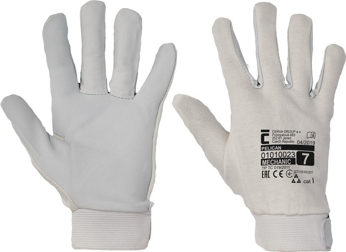 Pracovní rukavice Pelican Plus kombinovaná. Dlaňová část vyrobena z lícové kozinky (kůže) a vrchní část z bavlněné tkaniny (100% bavlna). S nápletem.