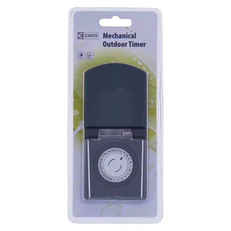 Mechanická spínací zásuvka s 24hodinovým cyklem. Minimální nastavitelný časový úsek je 30 minut. Krytí IP44 umožňuje použití mechanické spínací zásuvky ve venkovních prostorech. Provozní teplota -25 °C do +50 °C.