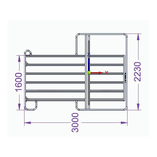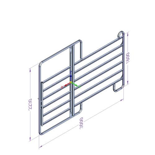 Výška od země 160 cm, výška vstupu 220 cm, šířka dveří 1,04 m s uzávěrem, fixační řetízek 2 x na jedné straně, plochá trubka 50 x 30 x 1,5 mm, rozteč příček 20 cm, kompletně žárově pozinkovaný.