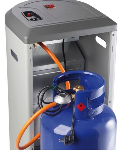 • Zdrojem je běžná 10 kg PB láhev nebo elektrická síť 230 V, která zefektivní vytápění místností i díky vestavěnému ventilátoru.
