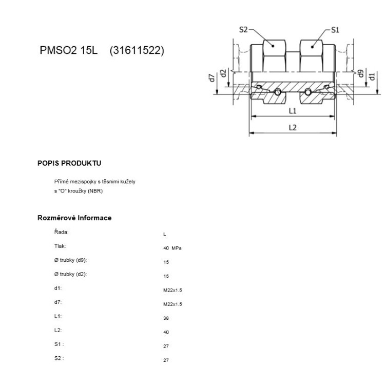Mezispojka přímá s těs.kužely M 22x1,5