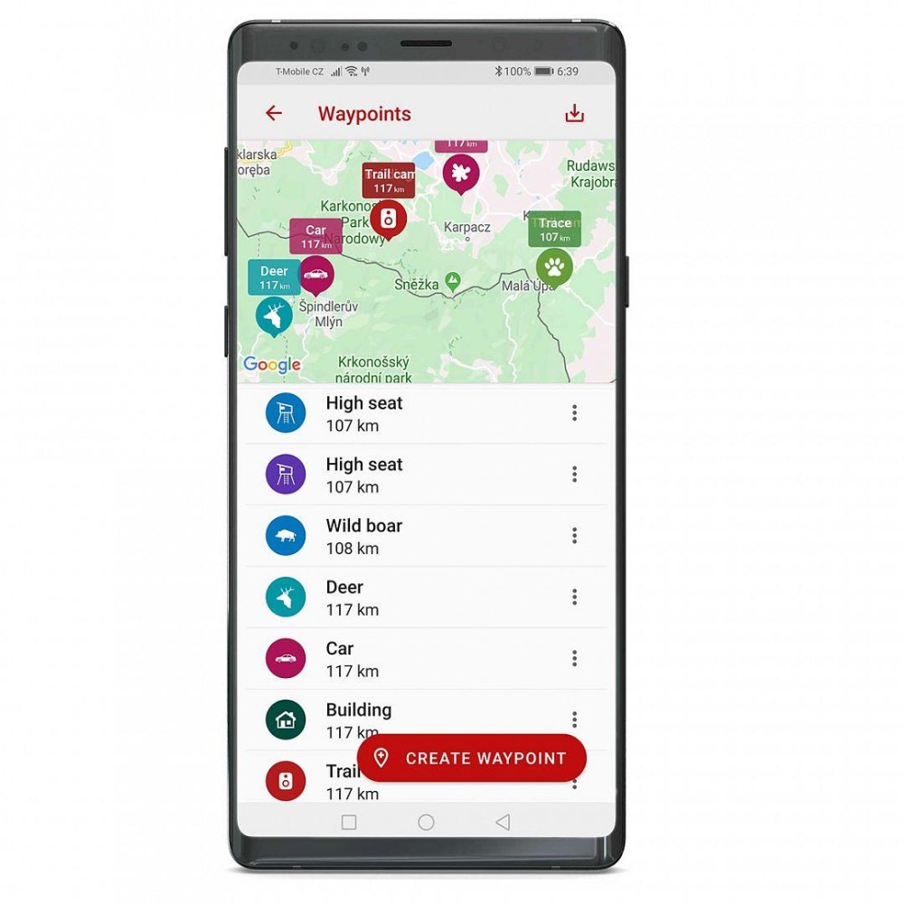 - Zobrazení všech zařízení (psi, další psovodi, waypointy) v mapě