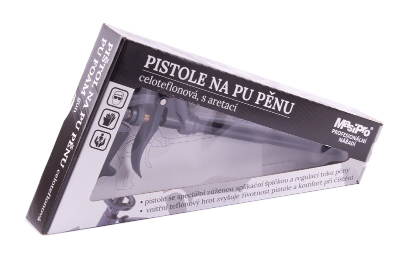 • vysoce kvalitní celoteflonová pistole se speciální zúženou aplikační špičkou a regulací toku pěny jednou rukou pomocí ovládacího šroubu