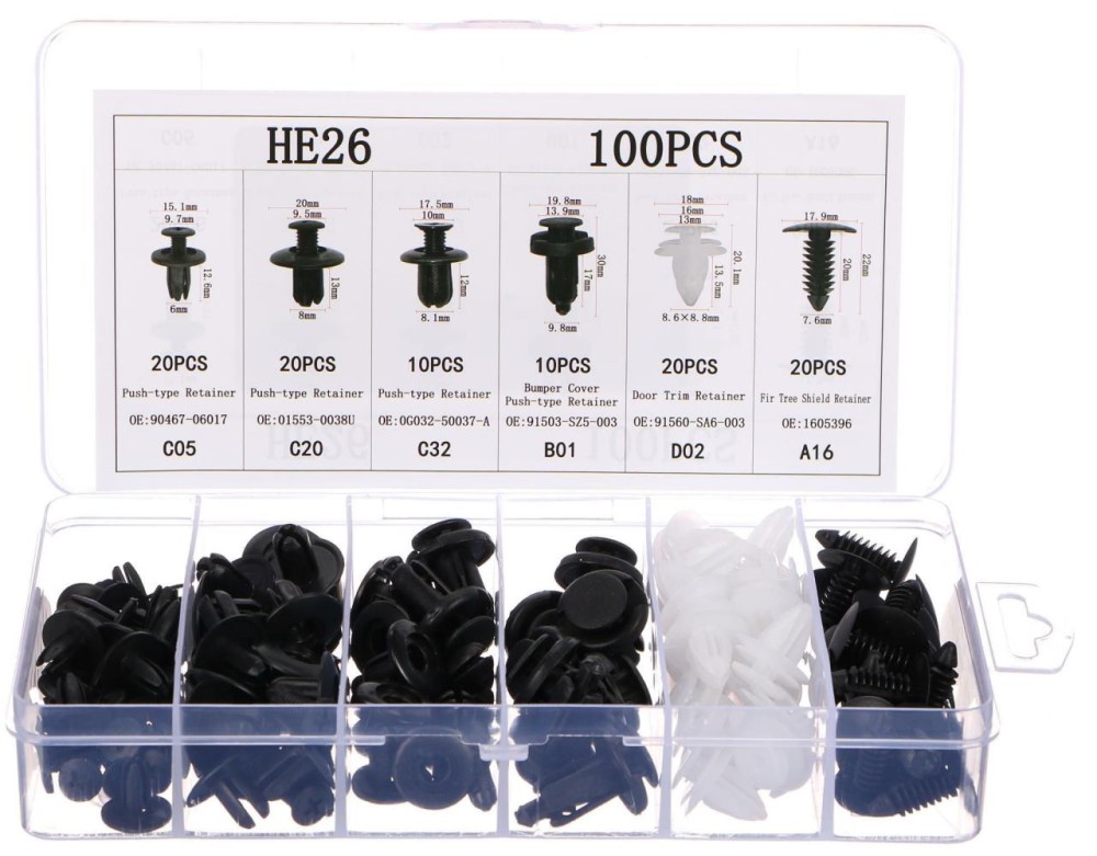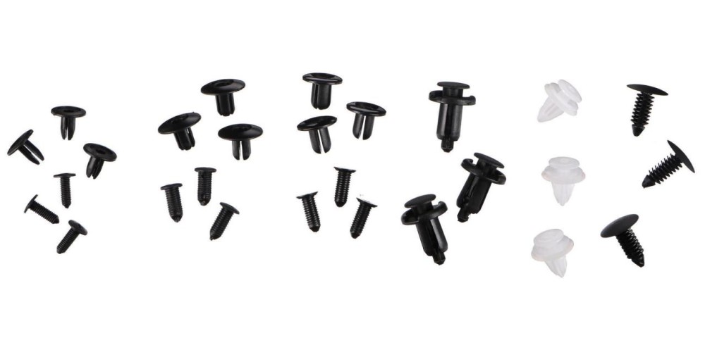 • 6 druhů příchytek a kolíků pro fixaci nárazníků, blatníků, krytů, čalounění (kufru), sedadel a obložení, uchycení dveřích panelů