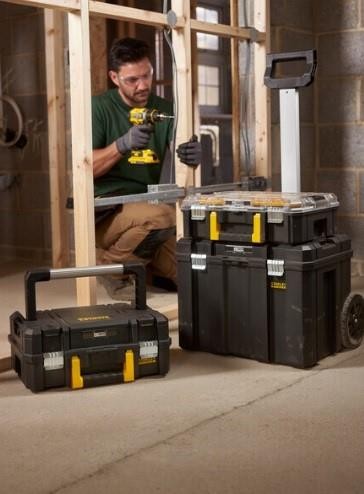 Mobilní pojízdná sada kufrů FatMax Pro-Stack je vybavena odnímatelným držákem nářadí, kovovými upevňovacími prvky a závěsy, širokou ergonomickou rukojetí z dvou materiálů a polypropylenovým tělem.