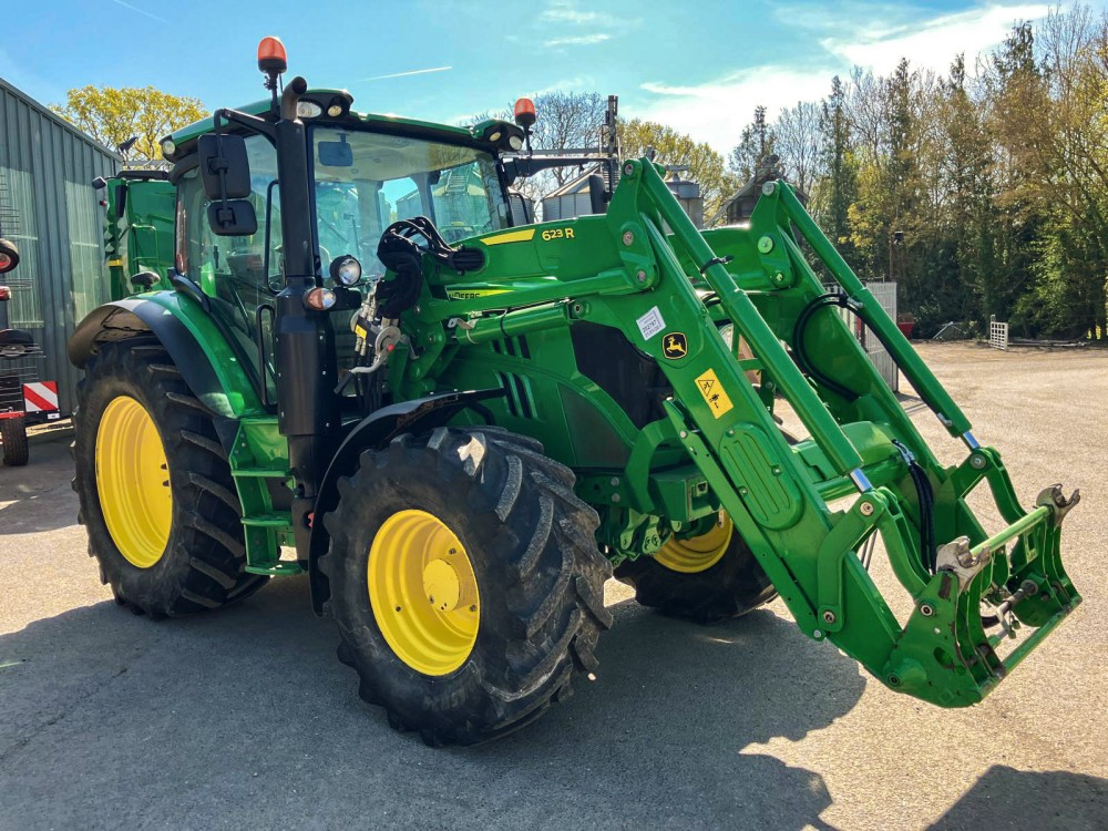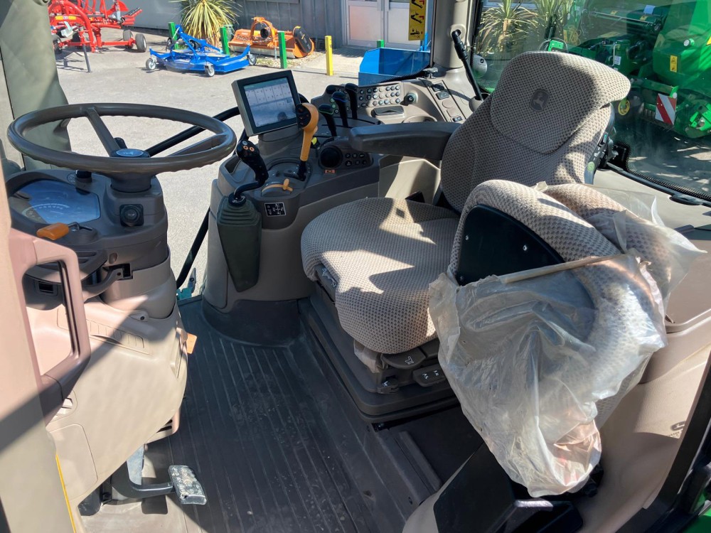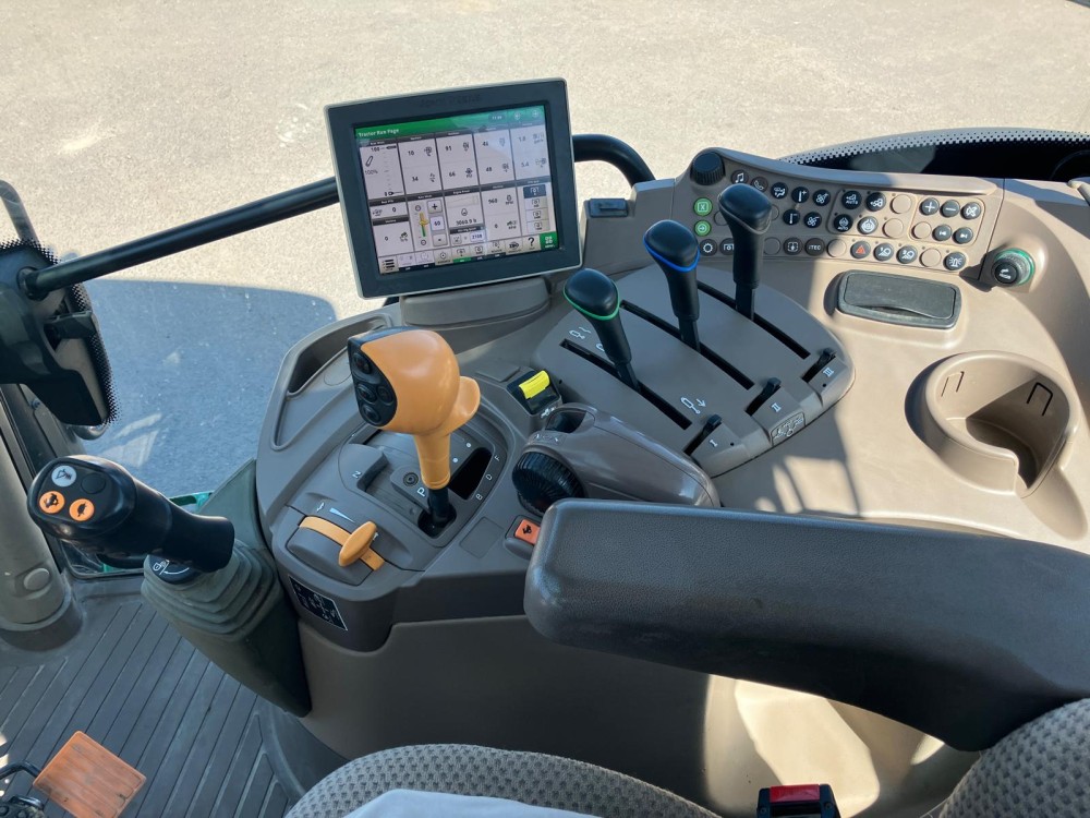 Specifikace: Převodovka AutoQuad PLUS, Displej CommandCenter 4200, Odpružená přední náprava, Odpružená kabina, Rádio Premium, Imobilizér, Vzduchové brzdy 2+0, Panoramatická střecha, Hydraulické čerpadlo 114 l/min, Příprava pro čelní nakladač, 3 mechanické hydraulické okruhy, Přední pneu: 540/65 R24, Zadní pneu: 600/65 R38, Závěs Automat, Výložník 623R